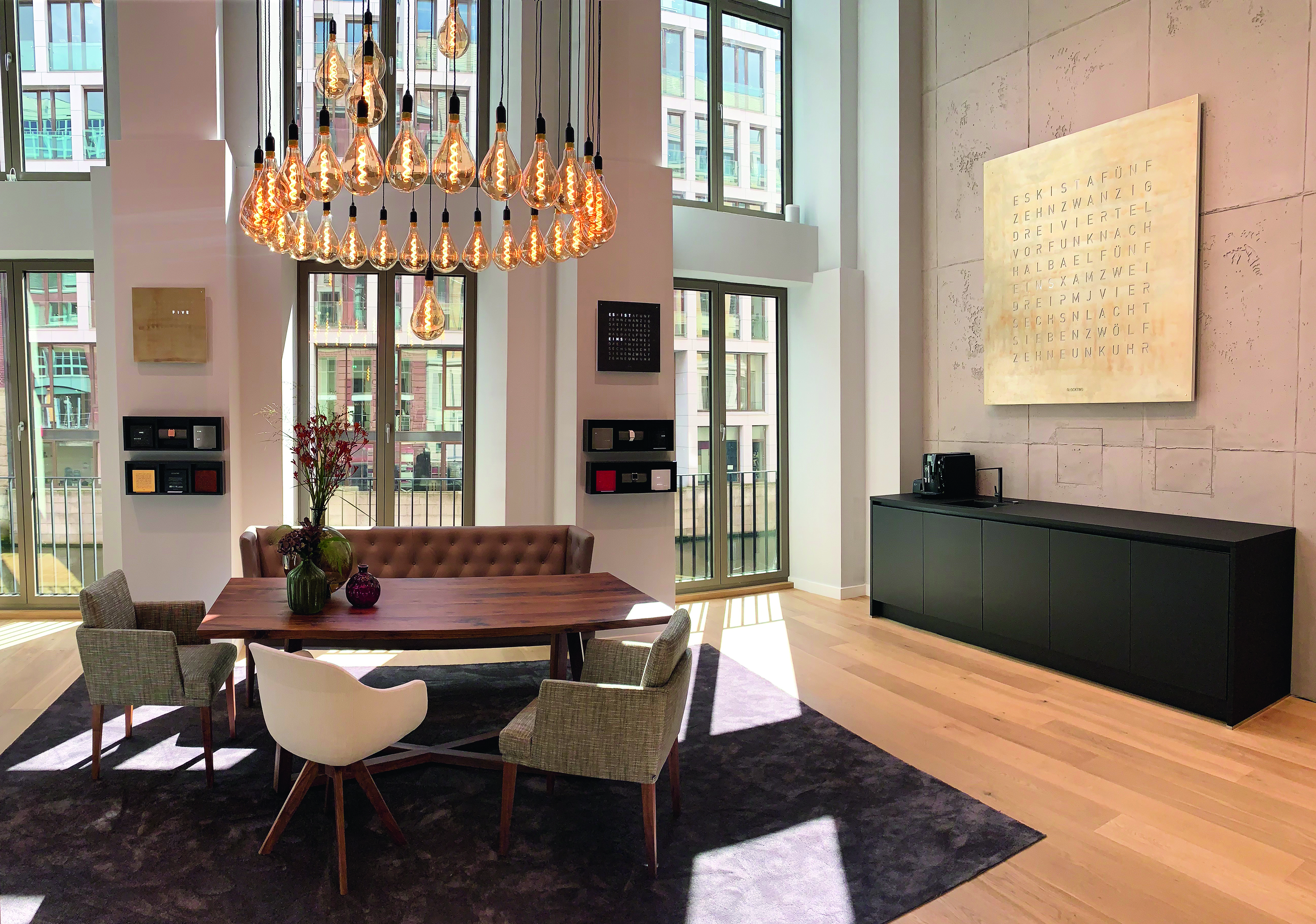 Der helle, großzügige Innenraum gibt der Marke eine beeindruckende Bühne für das gesamte Produktspektrum. Auch eine Qlocktwo 180 mit beinahe vier Quadratmetern Wandfläche, ausgezeichnet mit dem Red Dot Design Award 2019, wird hier spektakulär inszeniert.